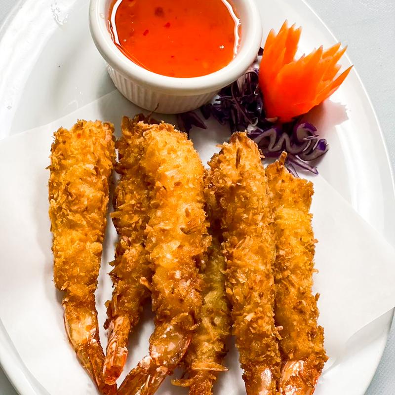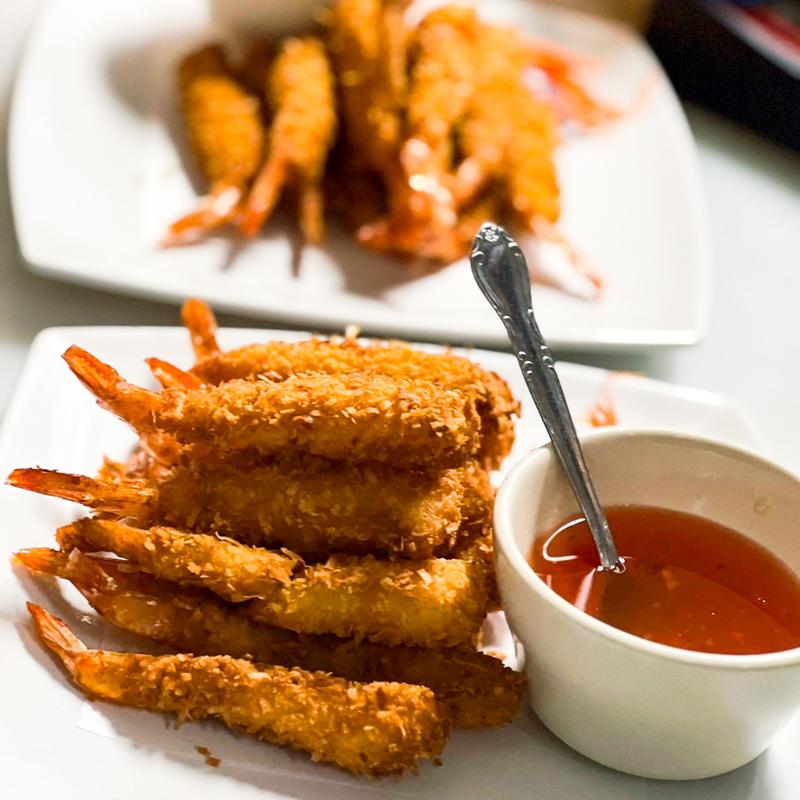 Deep-fried shrimp coated with coconut are served with sweet and sour sauce.