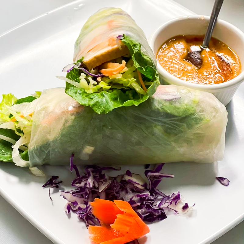 Tofu, rice noodles, and an assortment of vegetables wrapped in rice paper, served with peanut sauce.