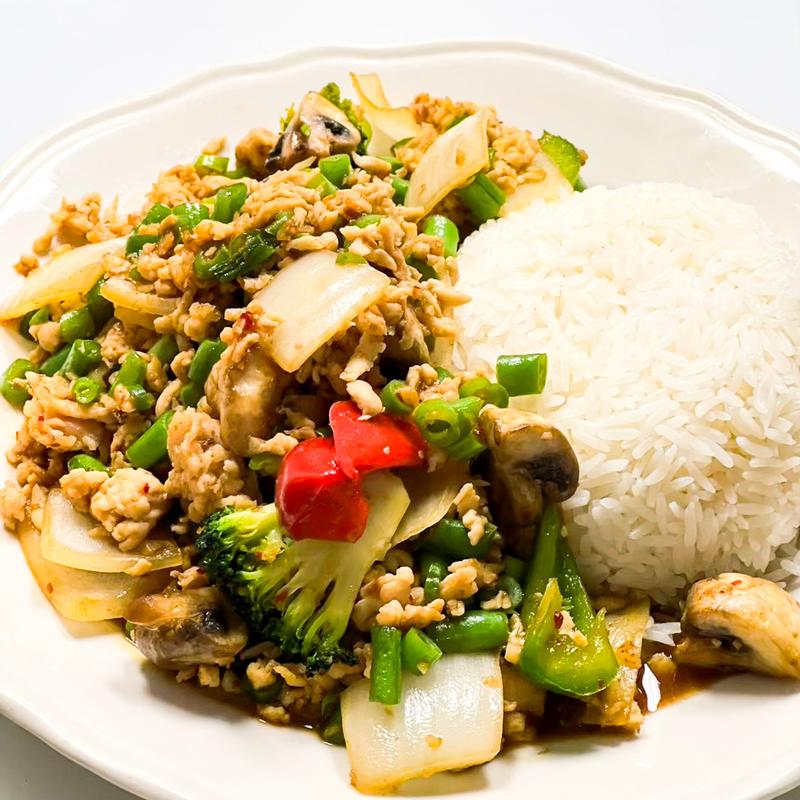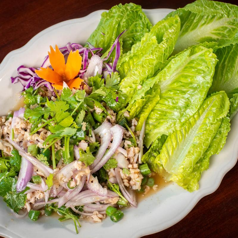 Ground chicken tossed with spicy lime juice served over spring mix.