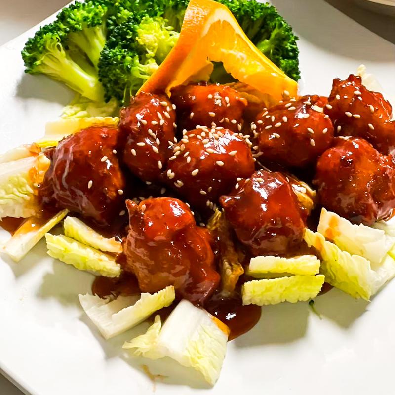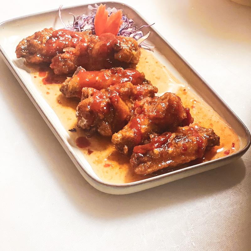 Crispy, gooey chicken wings with sweet & spicy sauce.