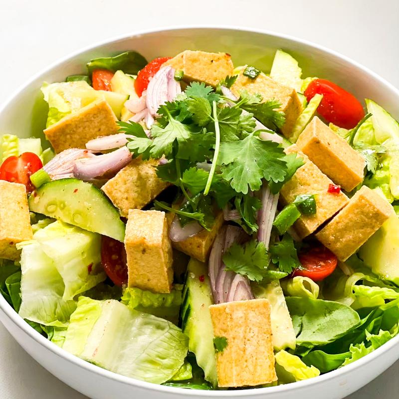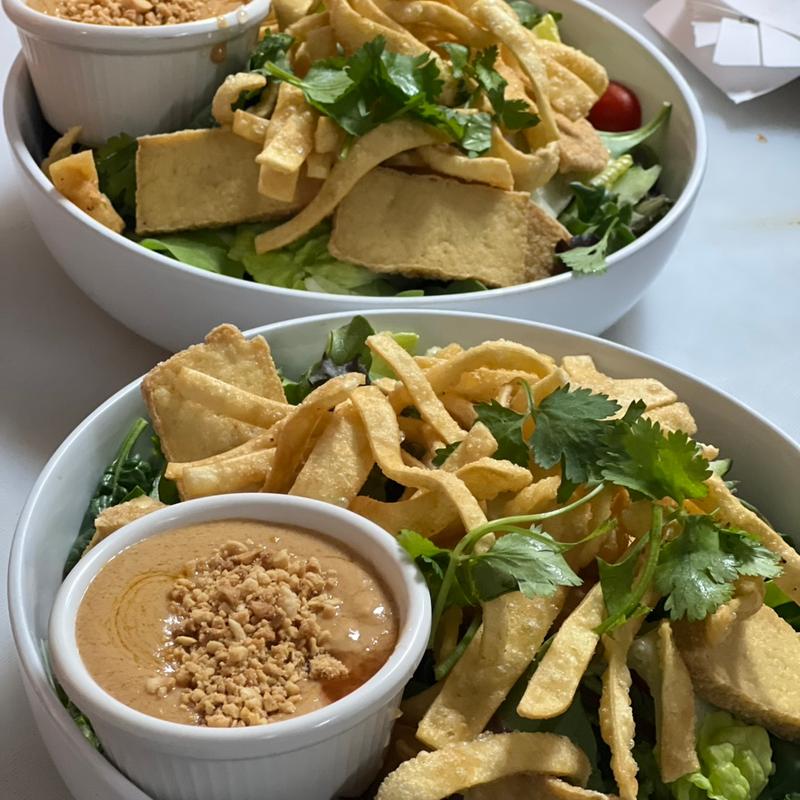 Green veggies, onion, cucumbers, tomatoes, tofu, crispy wontons with peanut sauce.