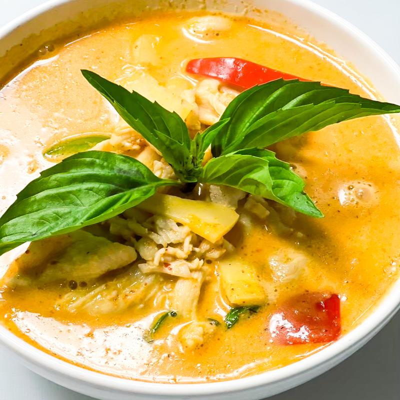 Coconut milk broth with tomato, mushroom, onion, cilantro, and lime juice.